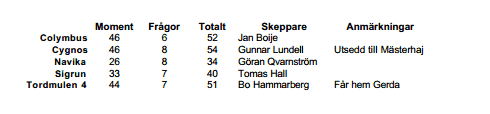 Starten för första båt gick kl 1500. Sedan följde de övriga efter med fem minuters mellanrum. Banan gick först västerut runt Äpplarö, sedan norrut till en boj som mästerhajen lagt ut, därifrån magnetisk kompasskurs ner till ett föremål i stranden på Äpplarö. Föremålet var en blå plastdunk. Den båt som styrde rättvisande kurs kom till en röd dunk. Vidare österut längs ön, söderut öster om Täckskär, runt Skäret, upp norrut Ö om Lundö, vidare österut runt Lökholmen, söderut Husaröleden, västerut S Jolpan, norrut genom Paradiset (mellan Idholmen och Ö Ingmarsö) och åter till Lill-Kastet. När alla lyckligt förtöjt efter ca 1,5 timmars lek bjöd Mästerhajen på hamburgare och grillkorv. ”Lokalen” var en gammal lada, helt öppen men erbjöd tak över huvudena.