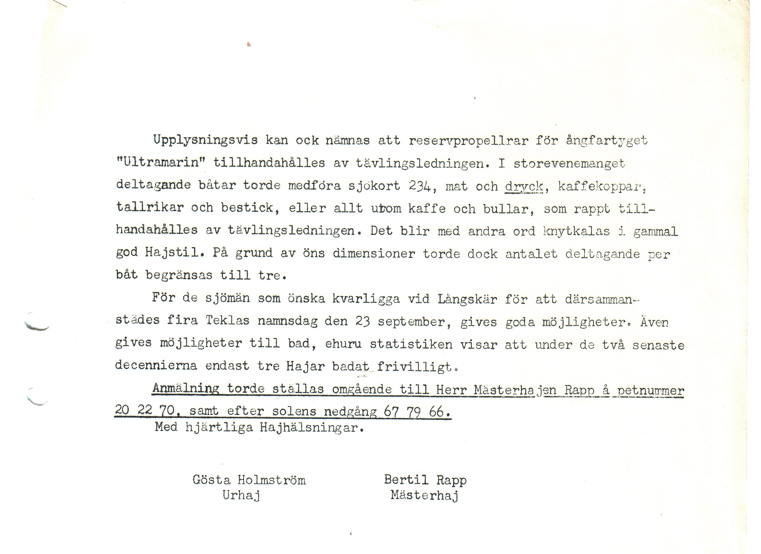 Inbjudan samt banbeskrivning ifrån 1951 års Hajlek. Mästerhaj var Bertil Rapp.